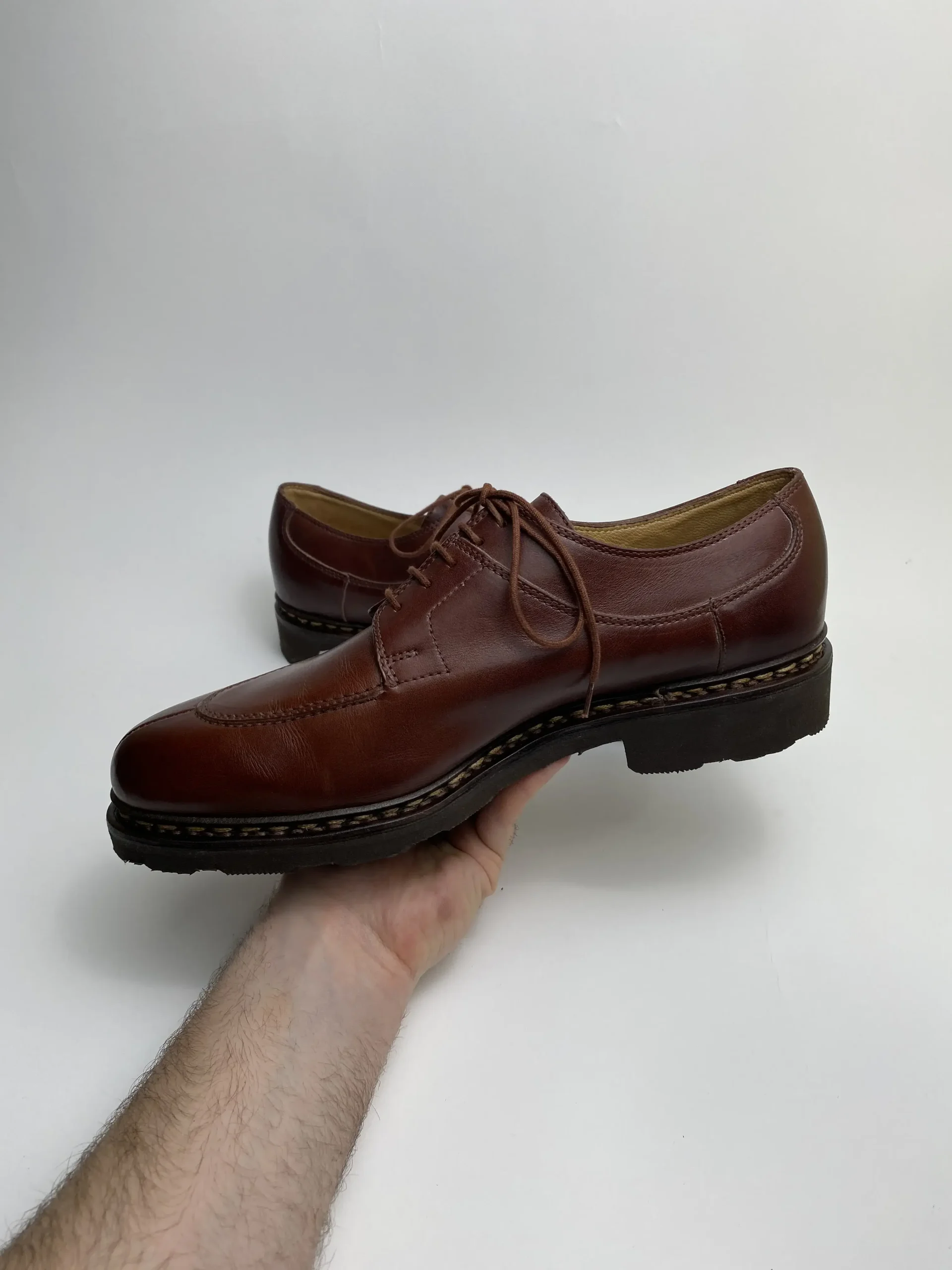 Ces derbies existent dans diverses matières, mais le plus souvent en cuir lisse. Ces souliers pour Homme sont de couleur Marron et de pointure 8,5. Ce beau modèle arbore une semelle cousue Norvégien. Un cousu que l'on trouve peu car plus difficile à faire. Associant la couture à intercalaire, le collage gomme qui s'ajoute vous assurera une paire plus que réparable.